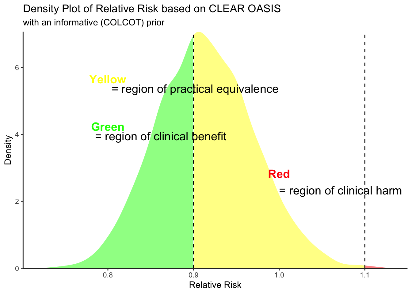 For the current CLEAR OASIS results, initially let’s assume a vague priors so that the posterior probability distribution is completely dominated by the current data. We will estimate the probabilities for each arm and their relative risk (RR). From the RR posterior probability density one can further calculate probabilities for various cutpoints. For example, one might assume that we are particularly interested in probabilities that exceed a clinically meaningful benefit or harm. These cutpoints can be individually chosen but let’s again assume a benefit threshold of RR < 0.9 and harm threshold of RR > 1.1.