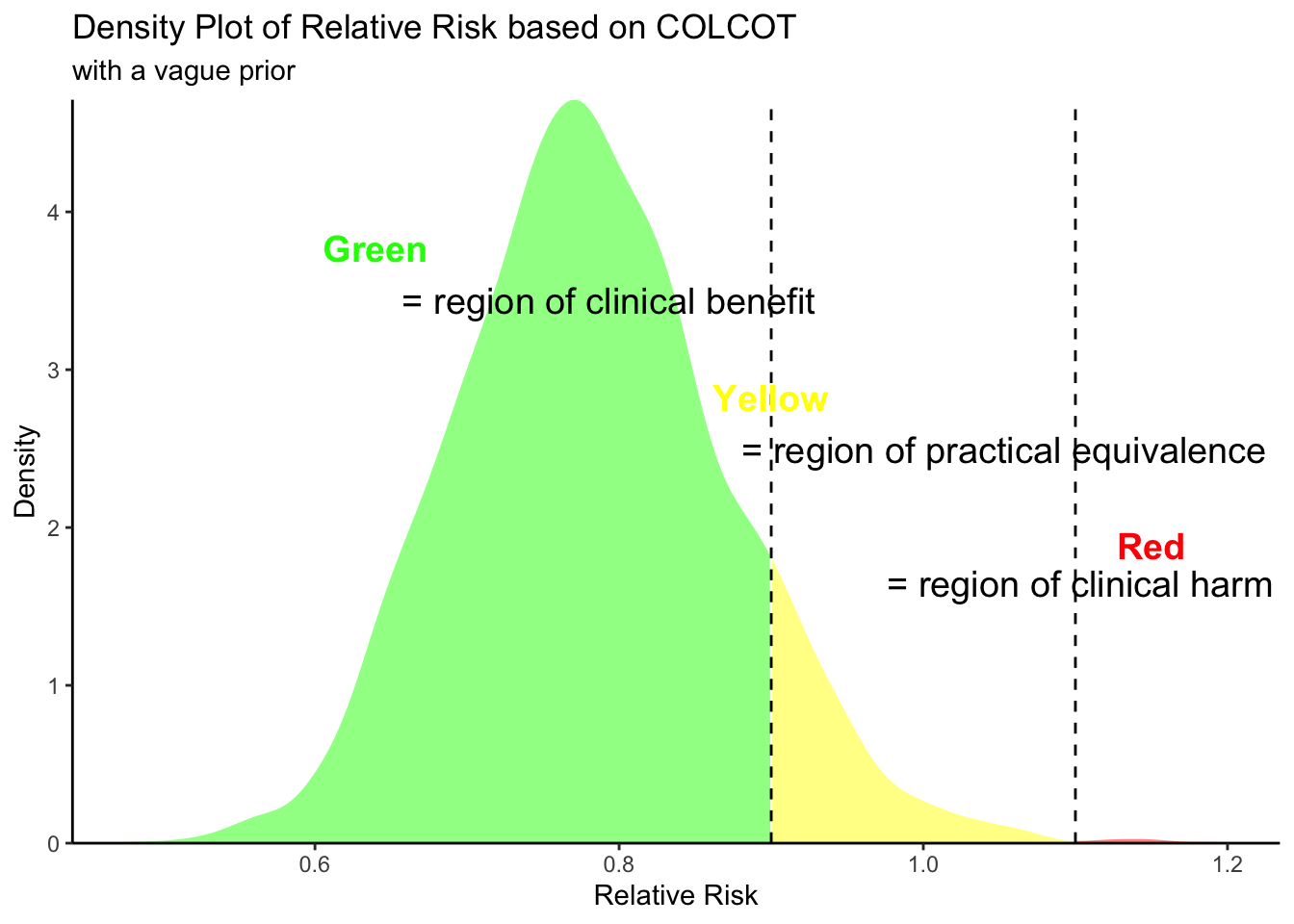 For the current PI to now be a disbeliever, perhaps his cutpoint for efficacy was RR < 0.80 and indeed this posterior probability is indeed very small. However this would imply that his prior efficacy belief based on COLCOT should also be based on the a probability of RR < 0.80 which was only 60%. This seems a fairly modest probability to have been a strong “believer” in this therapy before the current study. The reconciliation of these different beliefs is somewhat difficult.