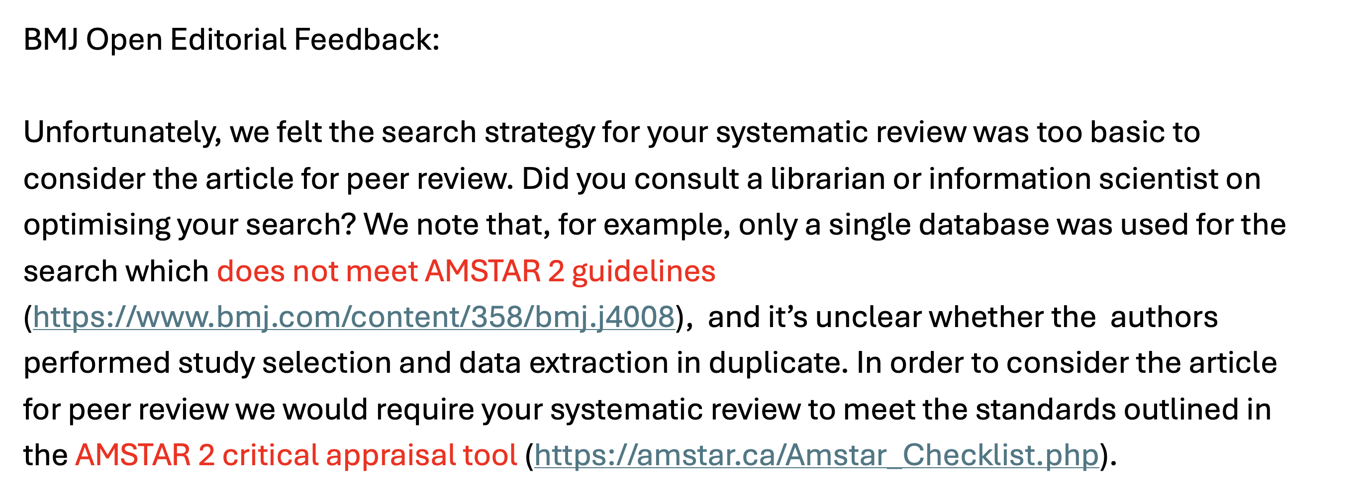 No consideration about the novelty or scientific merit of the manuscript, just an easy quick desk rejection because we didn’t follow a guideline of consulting multiple electronic database. No consideration that 12 previous meta-analyses had already done their due diligence checking multiple data sources and all had found only the same four RCTs that we analyzed. If the paper had been sent for peer review and the editor added as a minor comment the need to confirm to their standards by checking several electronic data sources, we would have gladly complied. But to be subject to a desk rejection for this trivial omission in this situation seems to border on the ludicrous.