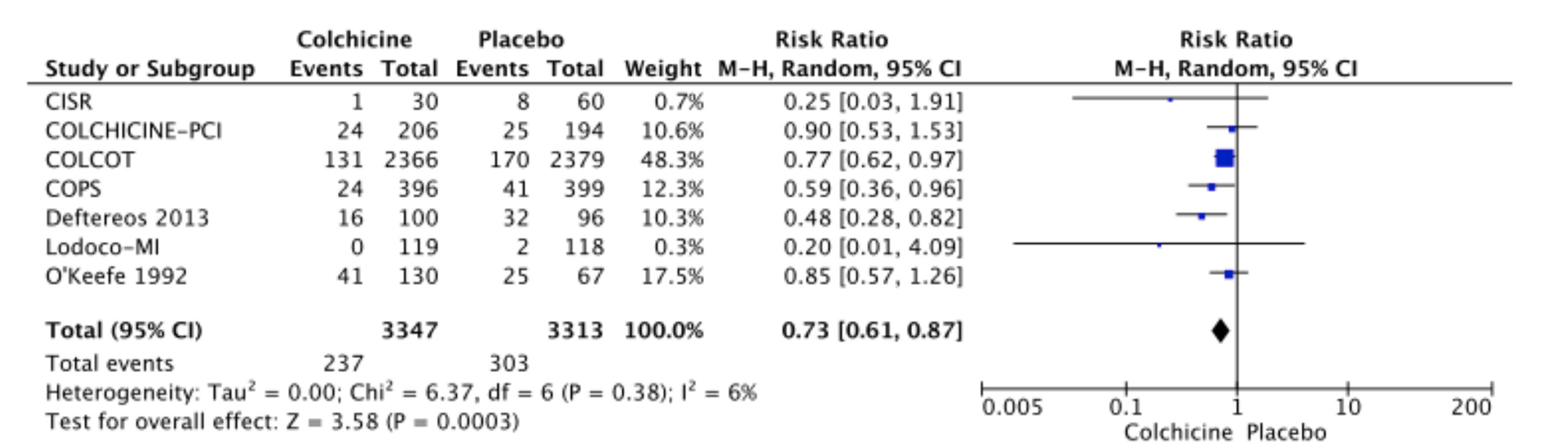 > “Colchicine significantly reduced the risk of MACE in patients with CAD who underwent PCI, mostly in the reduction of repeat vessel revascularisation, stroke and stent thrombosis (risk ratio 0.73 (95% CI 0.61 to 0.87); p=0.0003).